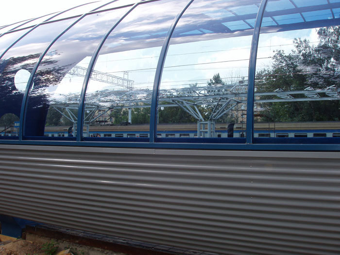 светопрозрачность (практически аналогично стеклу), гибкие и удобные в монтаже. Теплоизоляция (а следовательно парниковый эффект) у сотового поликарбоната в 1,34 раза лучше чем у стекла и пленки.