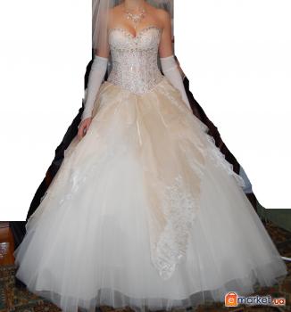 Продається вишукана італійська весільна сукня в ідеальному стані ніжного кольору шампань, корсет з"єднаний із спідницею, корсет обшитий камінням, зад корсету шнурується. В комплект додаю кільця.Розмір 42-44,зріст 160-170 |