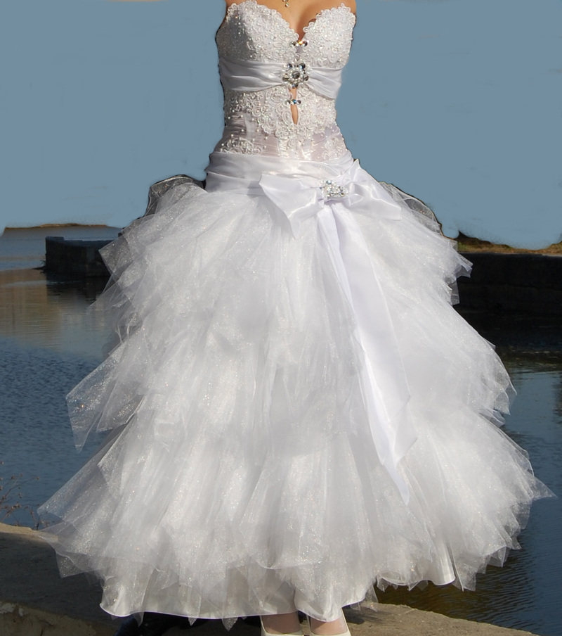 Білосніжний колір, понижена талія, корсет прикрашений великими та маленькими камінчиками. Ідеально лягає по фігурі. Корсет регулюється. Спідниця – «рваний фатін», тому кільця не потрібні (дуже зручно). Ціна – 1500грн. В подарунок віддаю рукавички. Тернопіль. Тел. 0977690495 |