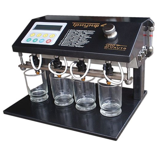 Работает от внешнего компрессора подачи воздуха. 1 увеличенного размера заливной бачок, куда поочередно заливается жидкость для очистки и тарировочная (проверочная) жидкость.