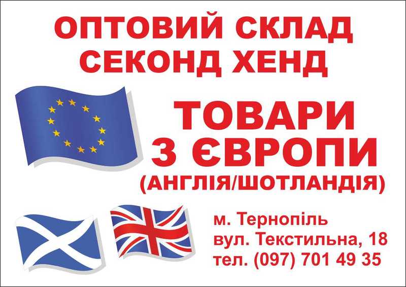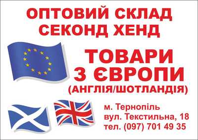 Оптова база секонд хен РЕТЕКС пропунує високоякісний оригінал Англія та Шотландія домашньої зборки. М. Тернопіль, вул Текстильна 18. Тел. 0979798792 |