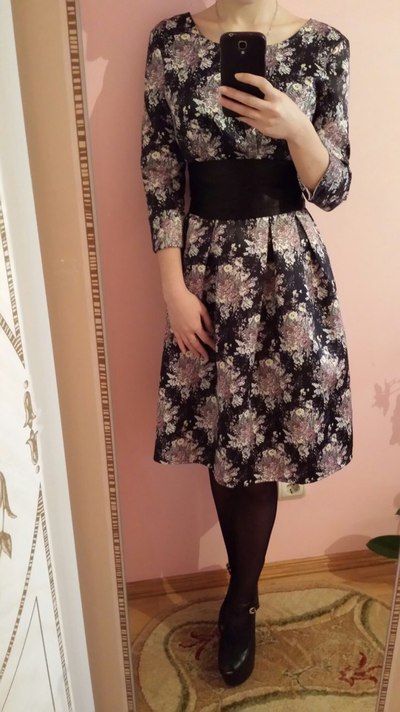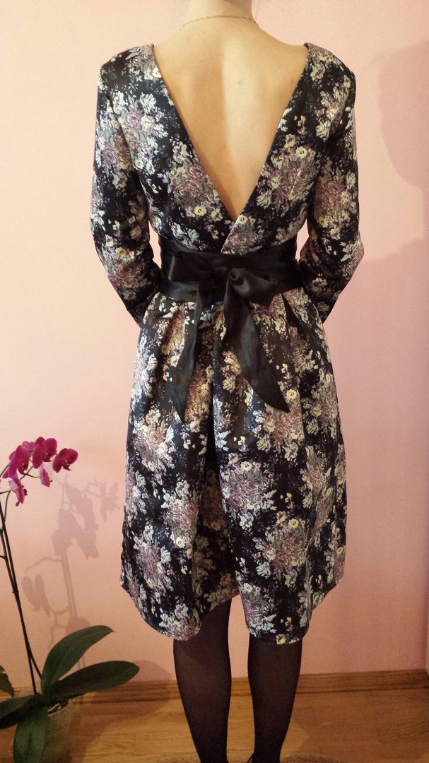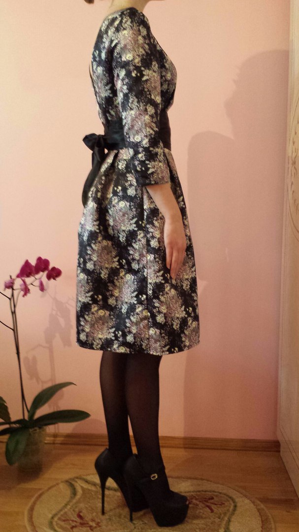 Жіноче плаття з поясом, тканина атлас з підкладкою, розмір S-M. Довжина плаття 88 см, рукав 44 см, спина з вирізом V. Нове, ніразу не вдівалося. |