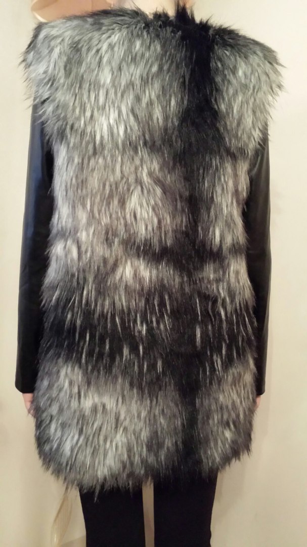 Штучна мєхова жилетка без рукавів на замку, довжина 75 см з чорною підкладкою, розмір S. |