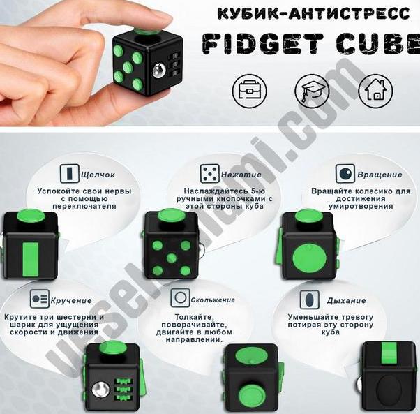 Кубик-антистресс Fidget Cube представляет собой игрушку, которая позволяет совершать полный набор тактильных манипуляций: крутить шарик, нажимать на кнопки, вращать шестерни, переключать тумблеры. Большинство действий беззвучны, но чрезвычайно аддиктивны. Отвлекаясь на куб, человек успокаивается, благодаря чему может работать более сосредоточено и эффективно |