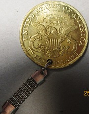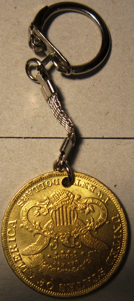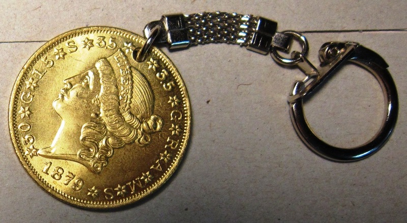 Брелок с натурной репликой золотой монеты 20 долларов США 1879 года чекана.Красивая вещь как для личного пользования так и для подарка к празднику 20 долларов США из золота – это единственная монета, которая не меняла стандарты чеканки на протяжении всего ее производства. Они были следующие: